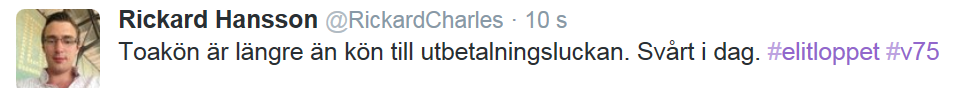"Mörka moln hopar sig över Stockholm Marathon – bokstavligt talat. Prognoserna från både SMHI och norska YR varnar för regn och temperaturer runt tio grader, eller strax under, på lördag. Motionärer som har tänkt delta i loppet, och framför allt åskådare som vill heja på, bör med andra ord planera därefter." Det gäller väl därmed också dom som ska besöka elitloppshelgen i år att planera för riktigt skitväder. Dom som inte ska besöka elitloppshelgen bör tänka på det spelmässigt, för det blev ju väldigt konstiga prestationer av många hästar förrförra onsdagen på Solvalla när det var en av regn påverkad bana. Det kanske värsta med det aviserade skitvädret i helgen är kanske ändå att de sportsliga prestationerna då inte alls blir de samma som om det är 25 grader varmt, sol och kanonfin och snabb bana. |
