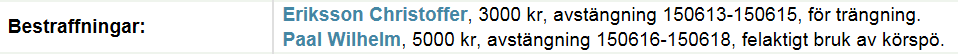 Kolgjini Dante, avstängning 150613-150626, för ouppmärksam körning/ridning som stört medtävlare.