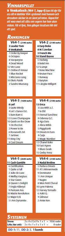 1) 3,9 (jag har vunnit mycket på 3 men 9 är väl betydligt bättre) 2) 3,4,5,6,10 (här vinner nog 3 till 11 %) 3) 4,8 (jag har svårt för Klaus Kern - Erik vinner) 4) 6,8,11,13,14 (gillar Thorson men inte vinner väl 3) 5) 11 (Lennartsson låter konfident) 6) 3 (Reijos känns stenklar) Kostar 100 kronor. |
