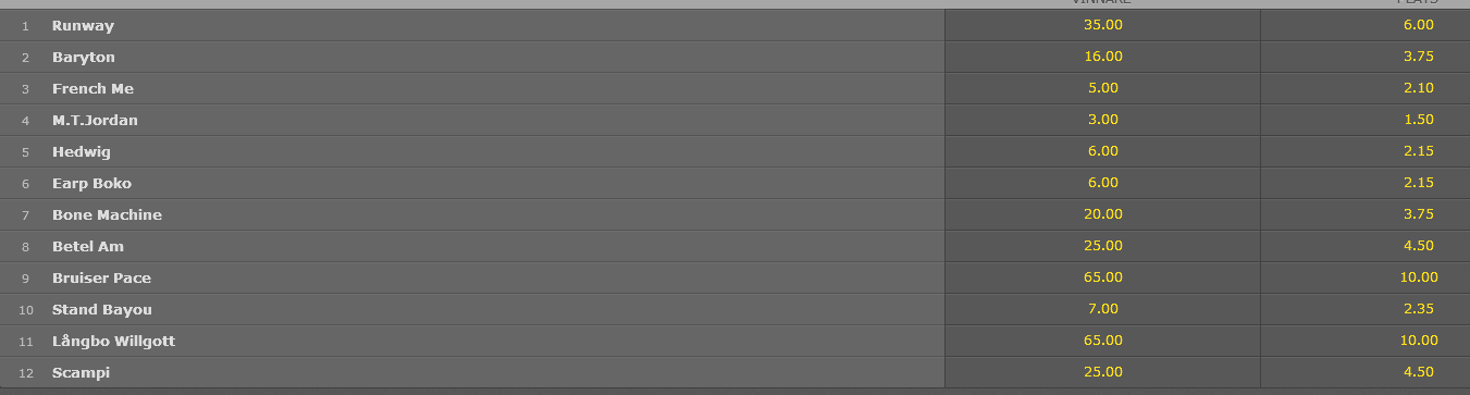 Tror inte du får något vidare odds, M.T lär bli och är redan favoritspelad på vinnare, det dubbelröda lär göra att det består. French Me har haft vinnarspel på sig hela dagen, stod i 2.50 tidigt i morse. |