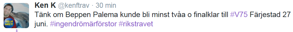 Beppen Palema kollade jag oddset på hos Unibet när jag såg att den skulle gå barfota runt om ffg. 27 ggr då. Nu nerspelad där till 18,50.