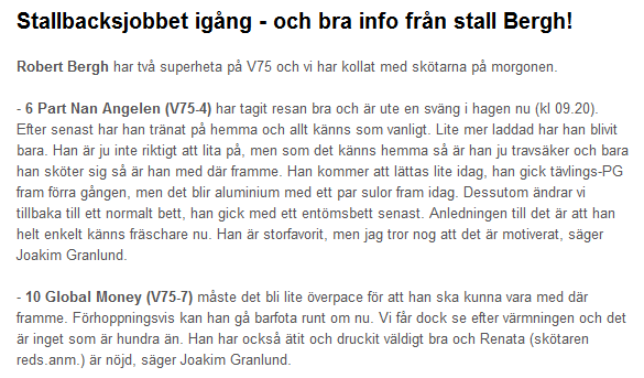 1) 1,2,6,8 r3-9 (tror 8 vinner) 2) 2,3,4,5 r1-9 (vore kul om 5 skräller efter sitt fina provlopp) 3) 9 r8-3 (världsstjärna mot stoloppor, som hon slagit förr) 4) 1,4,6,9,12 r3-10 (Untersteiner låter ovanligt positiv tilol 9, Berghs stall i oform) 5) 6,7,8,14 r12-9 (hoppas på skräll mot favoriten) 6) 5,6,9 r11,12 (5 sanslöst formförbättrad) 7) 4,6,10 r3-12 (dags för 6 nu, Erik vinner ofta sista V75) Kostar 1440:-. |
