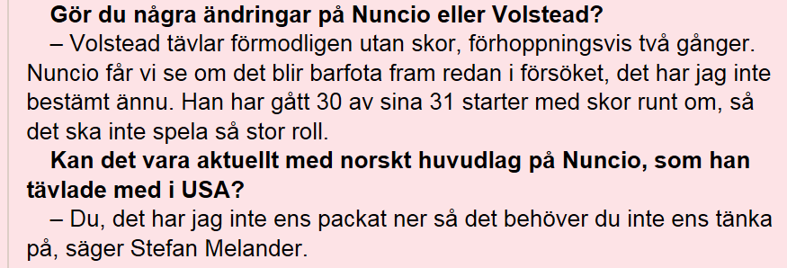 - Stefan Melander är ingen toppkusk - Loppet är försök till final Jag tror ändå att det är en av de klaraste vinstchanserna på V75 på mycket länge. Den enda rimliga konkurrenten är Sylvester America, men med tanke på det skrala försöksfältet är väl chansen mycket stor att optimal balans sparas till finalen och att Goop släpper till Melander i tidigt skede? Hästen känns dessutom som en som går allra bäst i ryggar. Melander är inte världens skickligaste kusk, men i det här loppet kommer det inte behövas (särskilt inte då det bara är sju hästar i fältet). Till runt 70 % är Nuncio en spelvärd spik alla dagar i veckan. Det är det inte många hästar som är. |