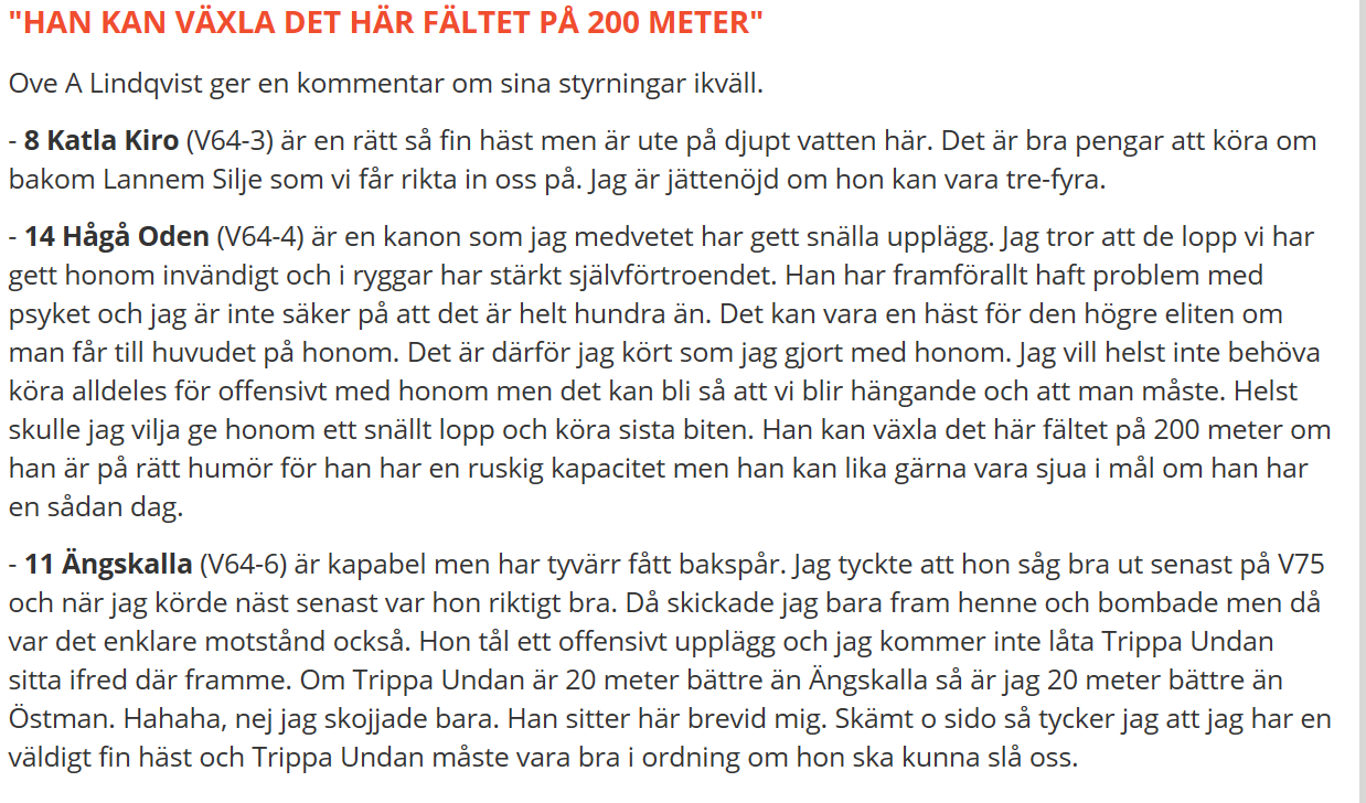 Med fältets överlägset starkaste häst, som tidigare gått 1000m först i 3e spår och nästan vunnit. Kör han vinner han lätt, nu hinner han inte hämta hem det han gav bort. 250 lax, och han försöker inte ens