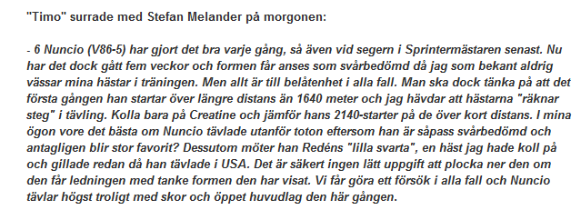 Spelar ingen roll vad Melander säger, jag tror att Nuncio gynnas av 2140 och den vinner ifrån dödens ikväll. Är det en världsstjärna så ska den kunna slå en lunchhäst