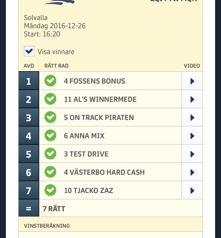 V75 Inlämnat: 2016-12-26, 15:21 Solvalla Måndag 2016-12-26 Start: 16:20 Kostnad: 252,00 kr Vadet gäller startnummer Avd 1: 4 Fossens Bonus 2: 8, 11, 14 3: 5 On Track Piraten 4: 6 Anna Mix 5: 2, 3, 4, 8, 10, 11, 12 6: 1, 3, 4, 5, 7, 8, 10, 11 7: 3, 6, 7 1x3x1x1x7x8x3 = 504 rader. 504 x 1 x 0,50 kr = 252,00 kr. Totalt: 252,00 kr. |