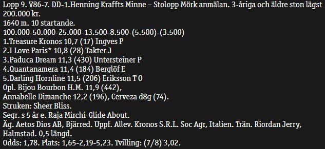 Står över DD. Treasure vinner första och sedan hoppas jag att Haugstad vinner andra så jag får sju rätt som tröstpris, men jävligt surt med Peters pålle i femte.