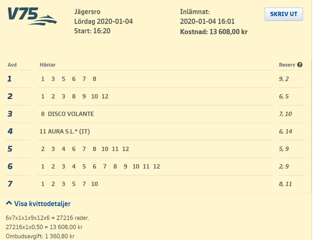 Verkligen på gränsen att de ska släppa iväg V75 på utsatt tid när de inte har ersättaren klar för Lugauer 20 minuter innan start... Men han kör ju inte supermycket lopp och det är en knepig häst Harran. Så det lutar väl åt att det blir ett minus på kusen.