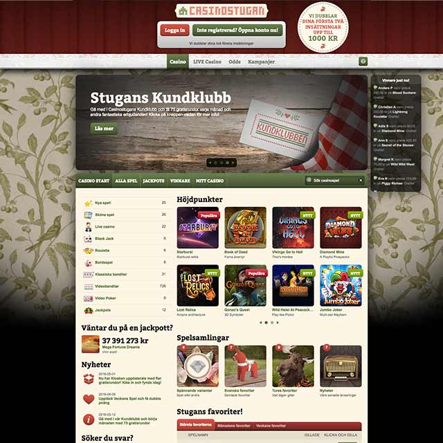 Sajten Casinostugan är unik för spelbranschen. Här finns det inga blinkande lampor och annat som liknar Las Vegas. Teamet bakom detta varumärke har istället satsat på att leverera ett nätcasino som känns svenskt och har älgar och röda stugor som genomgående tema.