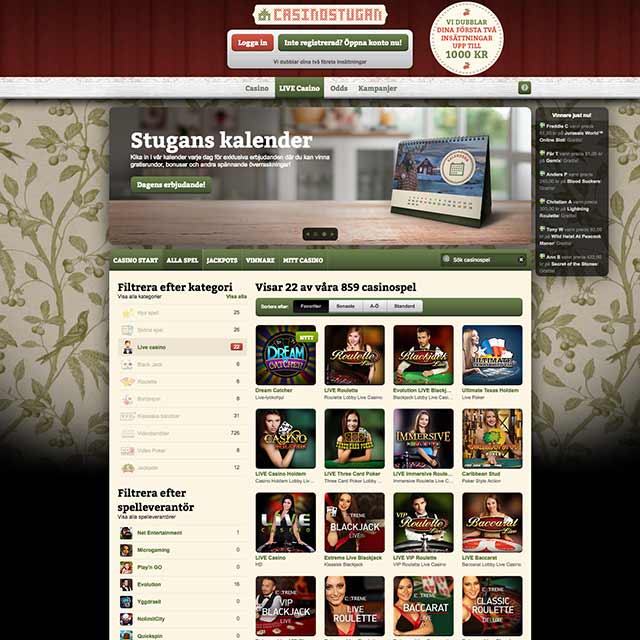 Casinot står i fokus för detta varumärke sedan lansering 2014. Casinostugan har hela tiden utökat utbudet samt även uppdaterat funktioner. Målet är att leverera absolut bäst upplevelse till svenska casinospelare, både vad gäller slots och live casino.