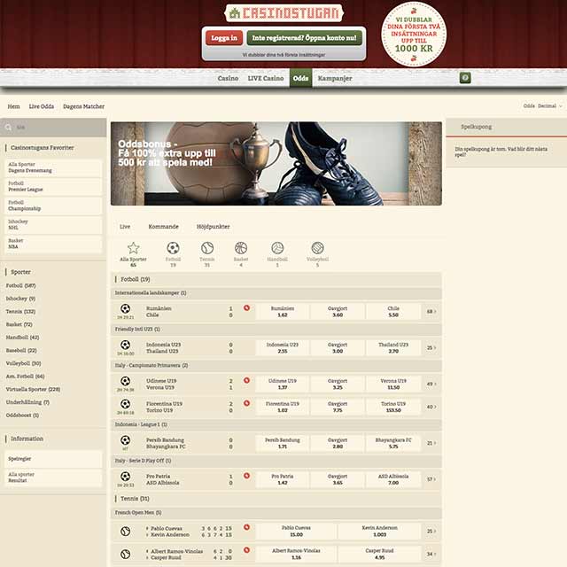 Föredrar du spela casino och odds på ett ställe, är Casinostugan ett bra val. Ifjol uppdateras plattformen, vilket gjorde oddsspel på sajten ännu smidigare. Här kan du känna dig trygg och säker när du satsar pengar på sport samt få extra pengar att spela för, när du hämtar ut din bettingbonus.