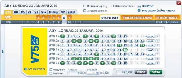 I första avdelningen så väljer jag hästarna nummer 1, 5, 7 och 10. I resterandelopp väljer jag endast en häst, jag väljer att ”spika” den jag tror absolut mest på. Detta gör ju då att jag har fyra olika utfall för att få sju rätt, man säger att jag har fyra olika rader på mitt system.
